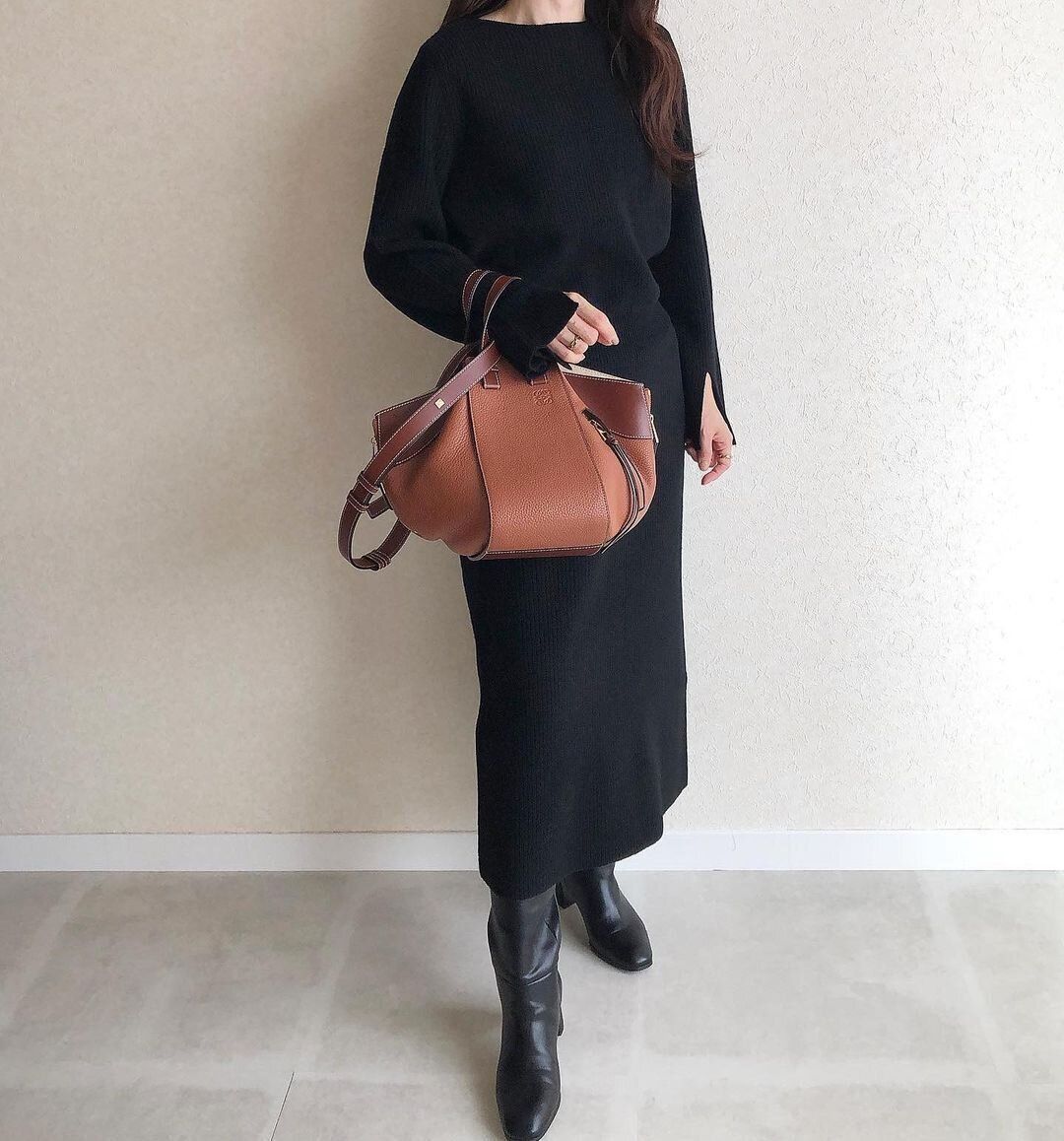 「ボートネックニットワンピース(長袖)/5,990円」は、シンプルながらも袖にスリットが入っていたり、ウエストの部分がブラウジングされているのでお腹周りがスッキリ見える優秀ワンピース。