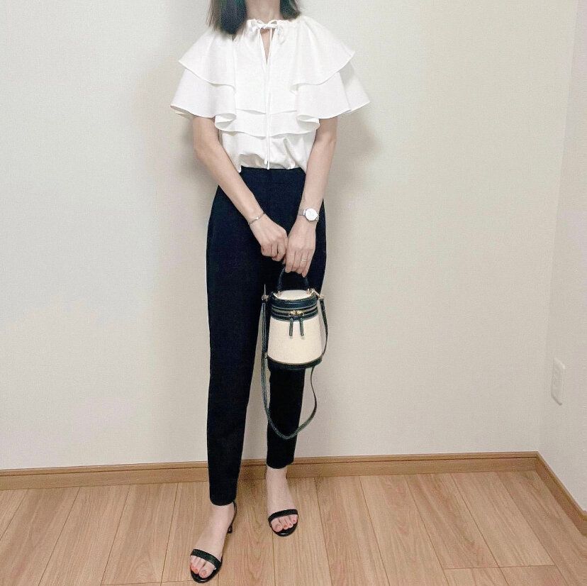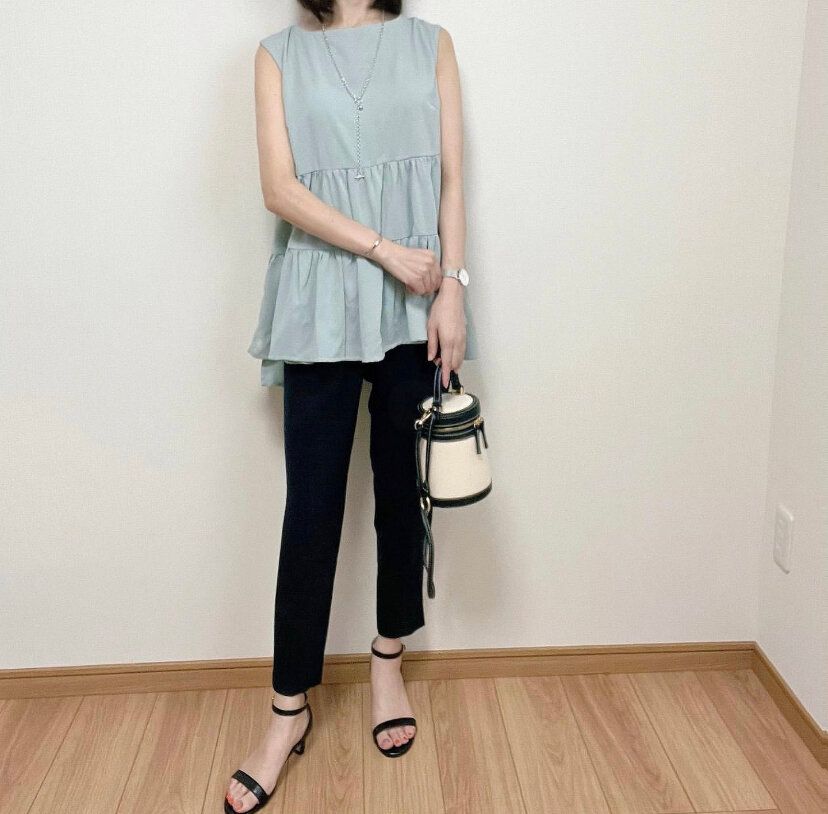 コーディネートに悩んだら一番にオススメしたいのが「ストレッチテーパードパンツ」を使ったモノトーンコーディネート。特にブラックは美脚シルエットに引き締めカラーのブラックという最強のパンツです。ペプラムデザインの女性らしいトップスを合わせてメリハリのある印象を与えるコーディネートはおしゃれに気になる部分をカバーできるお手本コーディネート。