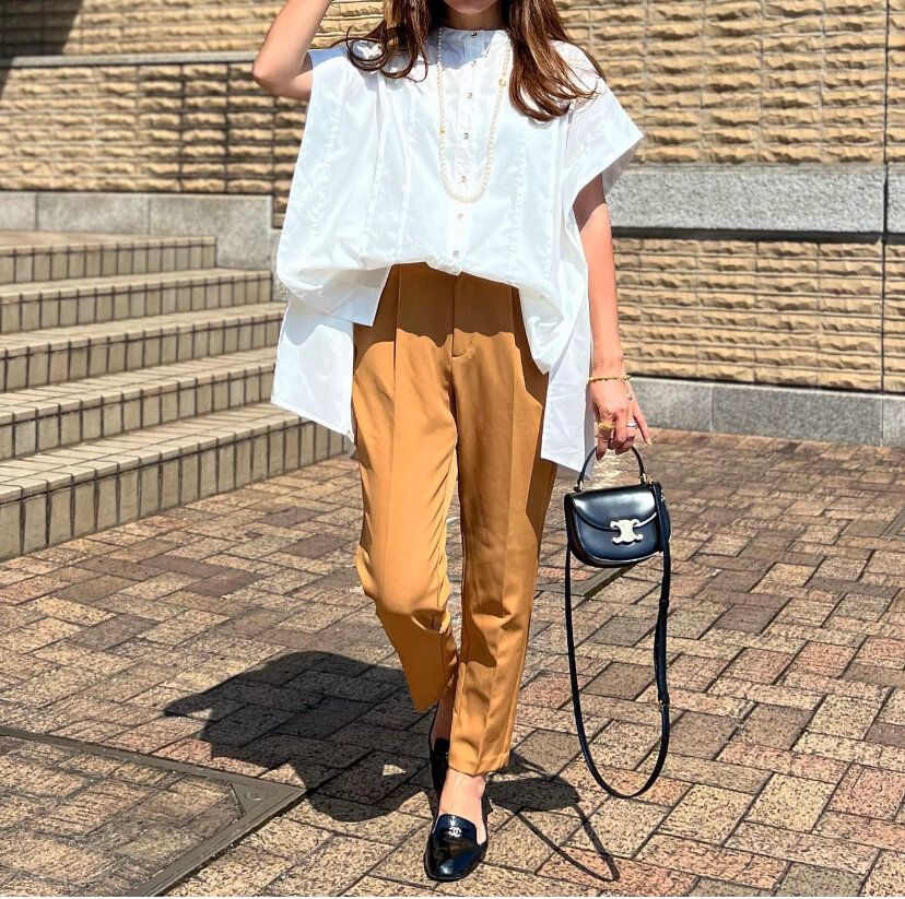 人気のティアードデザインのトップスは組み合わせによっては着ぶくれしてしまうちょっぴり着こなしに悩むアイテム。「ストレッチテーパードパンツ」は足を細くきれいに見せてくれるので、ティアードアイテムとも相性抜群です。メリハリのあるシルエットのコーディネートに仕上げてくれるのは「ストレッチテーパードパンツ」の魅力です。
