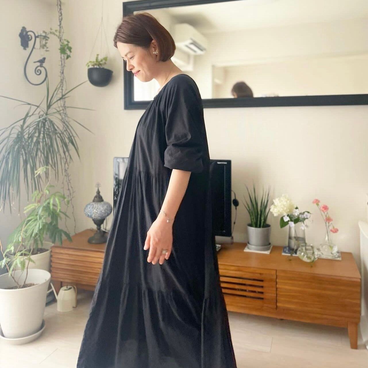 隠したいところはしっかり隠して、見せる部分はしっかり見せる、このメリハリこそがゆったりシルエットのワンピースを着こなすコツです。