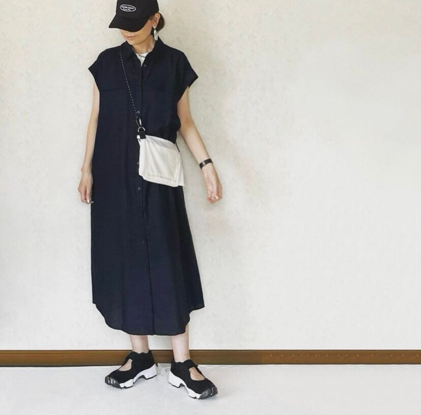 「リネンブレンドシャツワンピース(半袖)+E」(1,990円)は1枚でさらっと着てもおしゃれなワンピース。リネン素材とレーヨン素材がMIXされているブレンド生地を使用していて、涼しい印象を与えてくれるこれからの季節にピッタリのワンピースです。キャップやスポーツサンダルなど、スポーティーなアイテムと合わせればおしゃれなカジュアルスタイルが完成します。