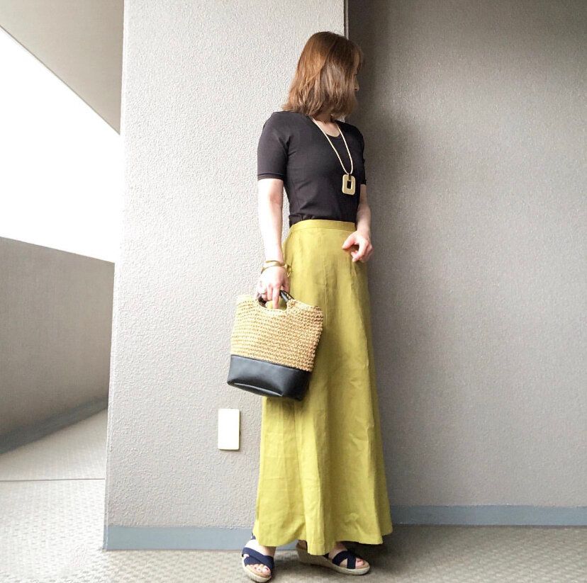 ハイウエストデザインの「リネンブレンドフレアロングスカート」はあえてトップスをコンパクトにすることでよりスタイルが良く見えます。