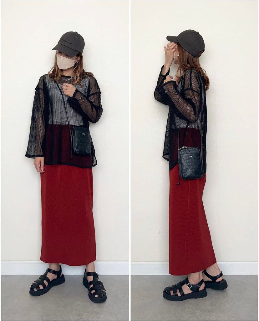 2WAYメッシュカーディガンはプルオーバー風に着用することも可能です。メッシュトップスならブラックでも涼し気で重たい印象にならず、暑くなってきた今の季節のコーディネートにピッタリ!ルーズなシルエットなので、スタイルよく見せたいならタイトスカートと合わせるのがおすすめです。