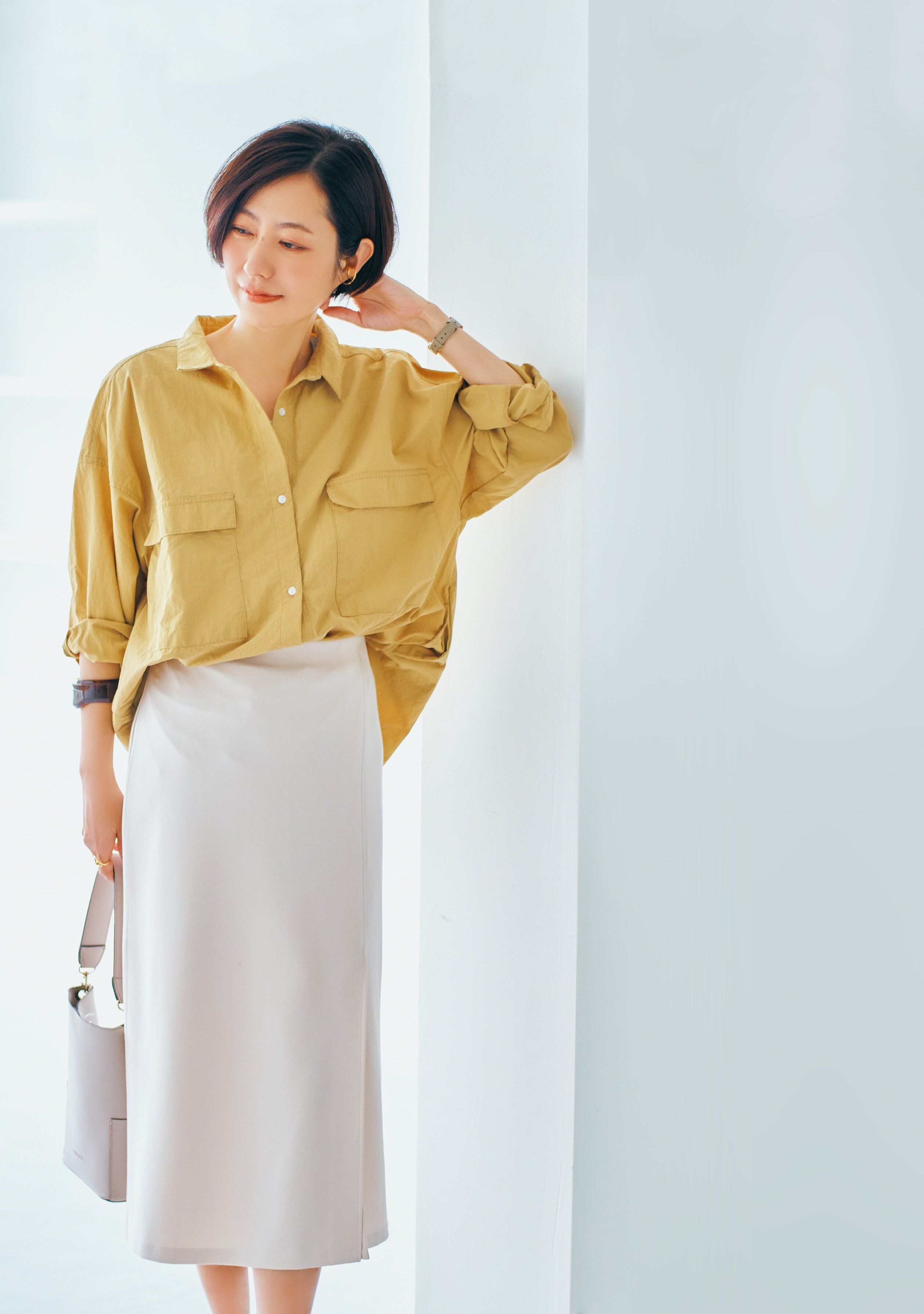 「ボトムを白っぽい色にすると、グッと夏らしい着こなしに。ふくらはぎが隠れる長さで、脚も細く見えます。タイトなシルエットだけれど、ストレッチが効いているから歩きやすさも良好!」。