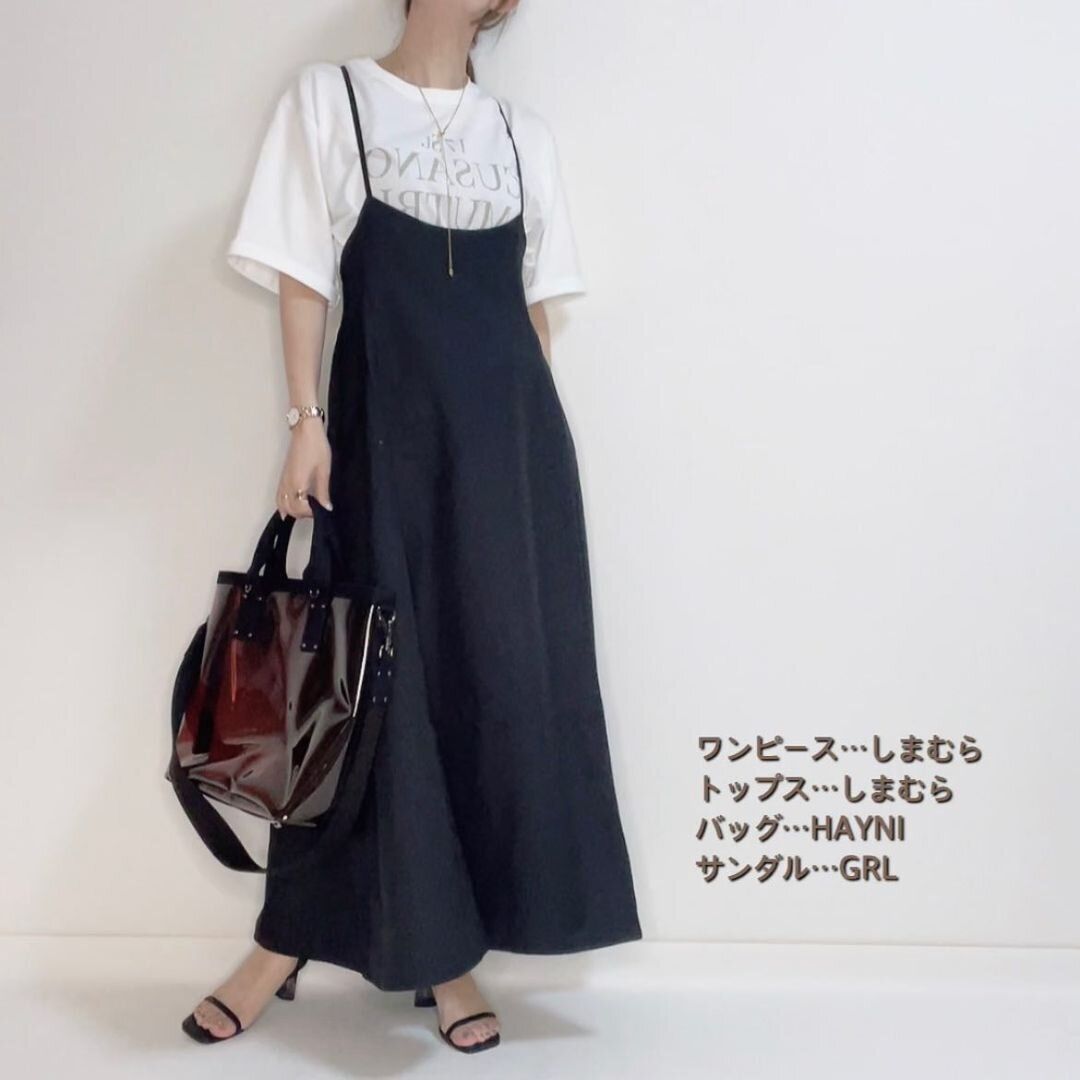 しまむらでコスパがよくて体形カバーができるワンピースを探しているなら「フレアキャミワンピース/1.639円」がオススメ。腰の高い位置に切り替えがあることに加え、華奢な肩ひもでスタイルアップを約束。合わせるインナー次第でいろいろなアレンジができるのも魅力です。