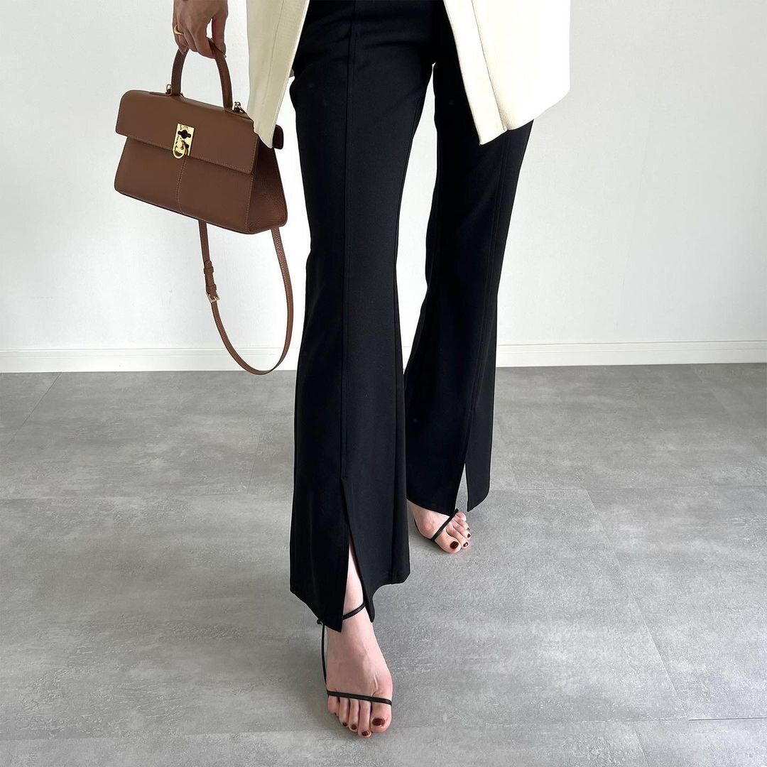GUの「ハイライズフロントスリットフレアジーンズB/2,990円」は、華奢な足首のきれいな肌見せが、脚長効果に直結。裾に向かって広がりのあるフレアシルエットでも、スリット入りで軽く見えます。足元合わせに悩みがちですが、足首が見えることが大切。お手持ちのサンダルを合わせれば大丈夫ですよ。