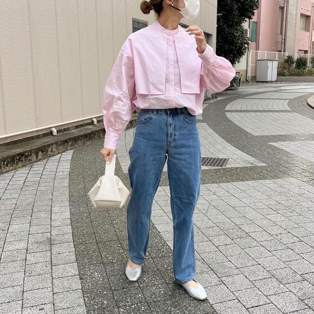 着映え感をダイレクトに感じられるのが、ケープデザインのシャツ。甘めのピンク色でも、直線的なデザインがきいているので意外にも大人っぽく着こなすことができます。デニム×トップスだけで手っ取り早く鮮度をアピールさせたいならデザイン性の高いケープシャツを!