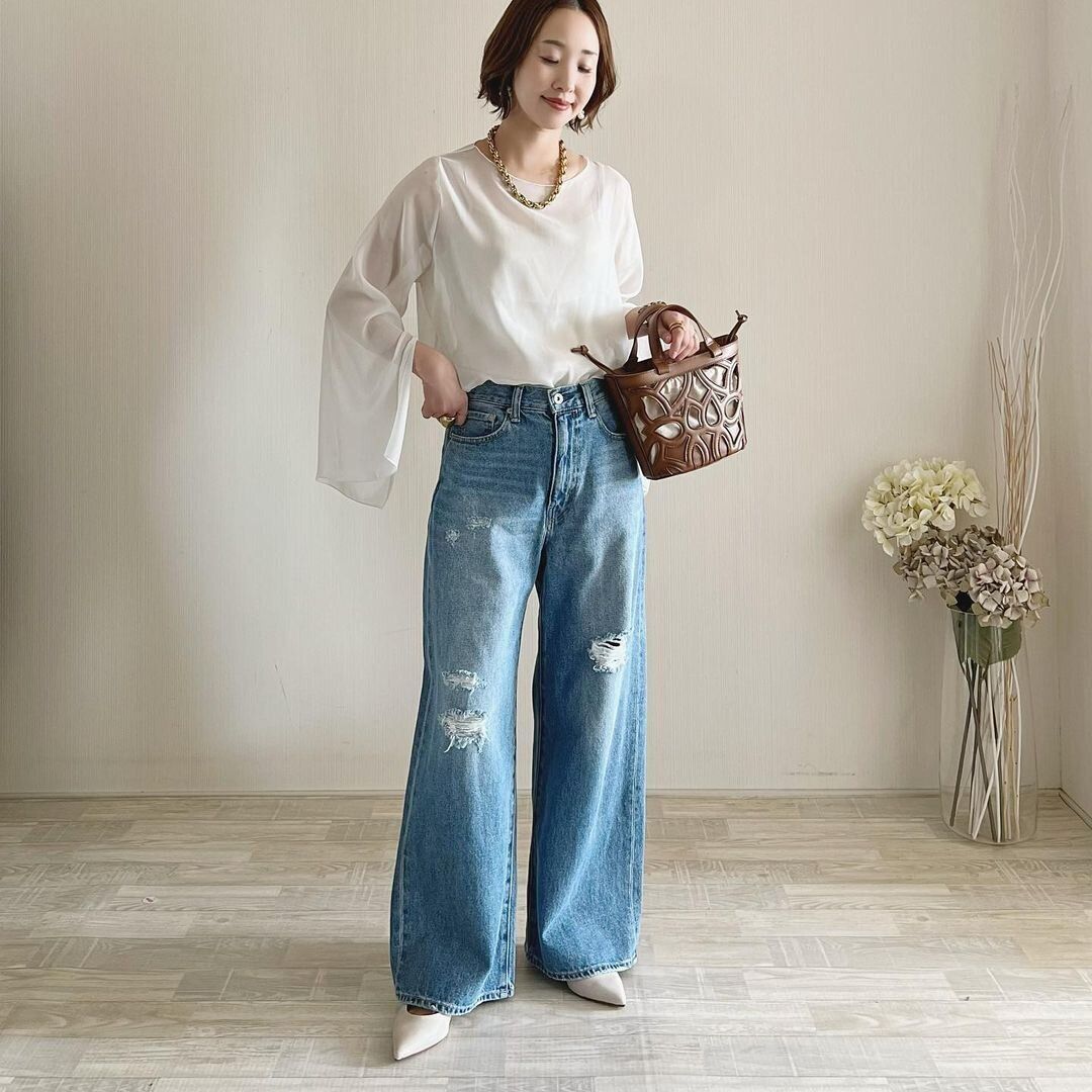 透け感があり、袖に大胆なスリットが入ったトレンドライクなプルオーバーも発見。デニムとシンプルに合わせるのはもちろん、ジャンパースカートやワンピースのインナーとしても持ってると便利な1枚です。
