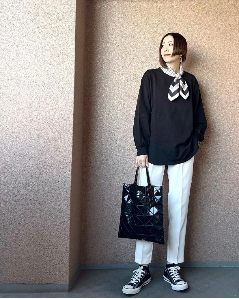 「ミニ裏毛オーバーサイズT」は合わせる小物よってファッションの幅が広がるマルチアイテム。シンプルなモノトーンコーディネートもスカーフを合わせるだけでカジュアルな中にも品のある大人っぽいコーディネートに。スウェットでは合わせるのがむずかしいアイテムでも絶妙な生地感のミニ裏毛オーバーサイズTなら取り入れやすいですよ。