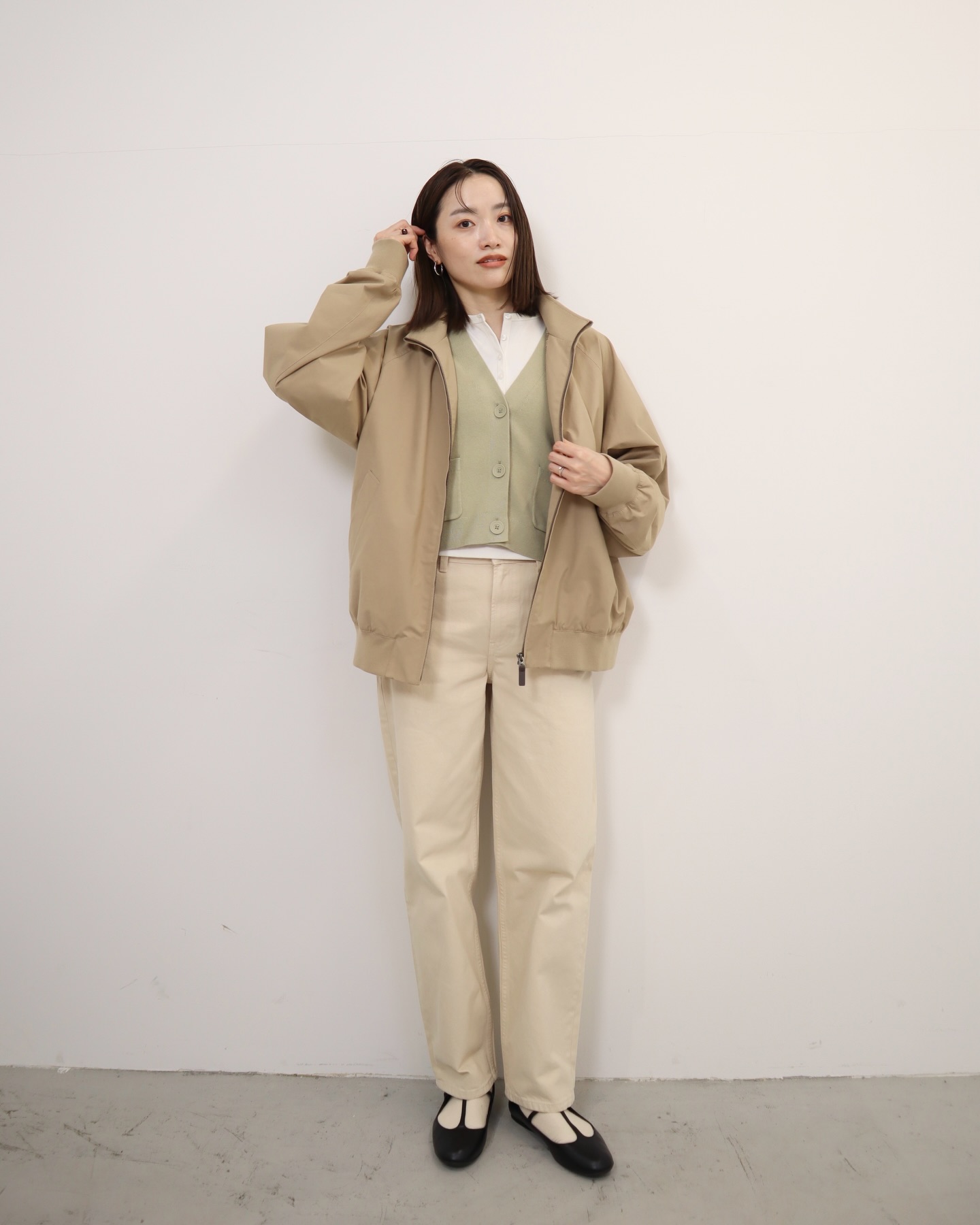 中に着るトップスは、カットソーでもシャツでもバッチリ。ショート丈のアウターなのでワイドシルエットのボトムスと合わせると全身バランスがきれいにまとまります。
