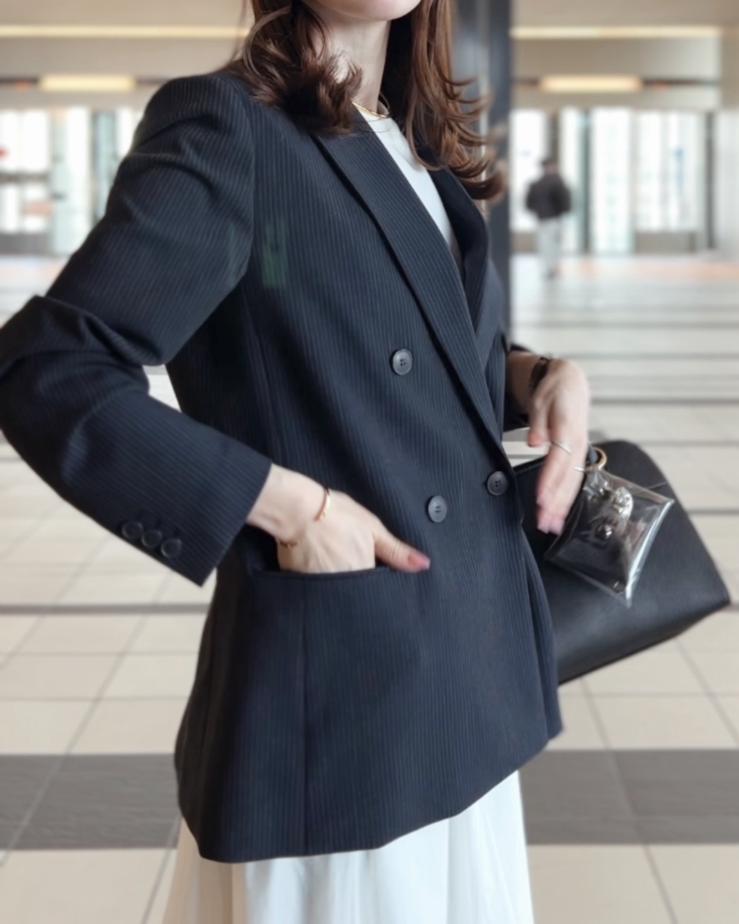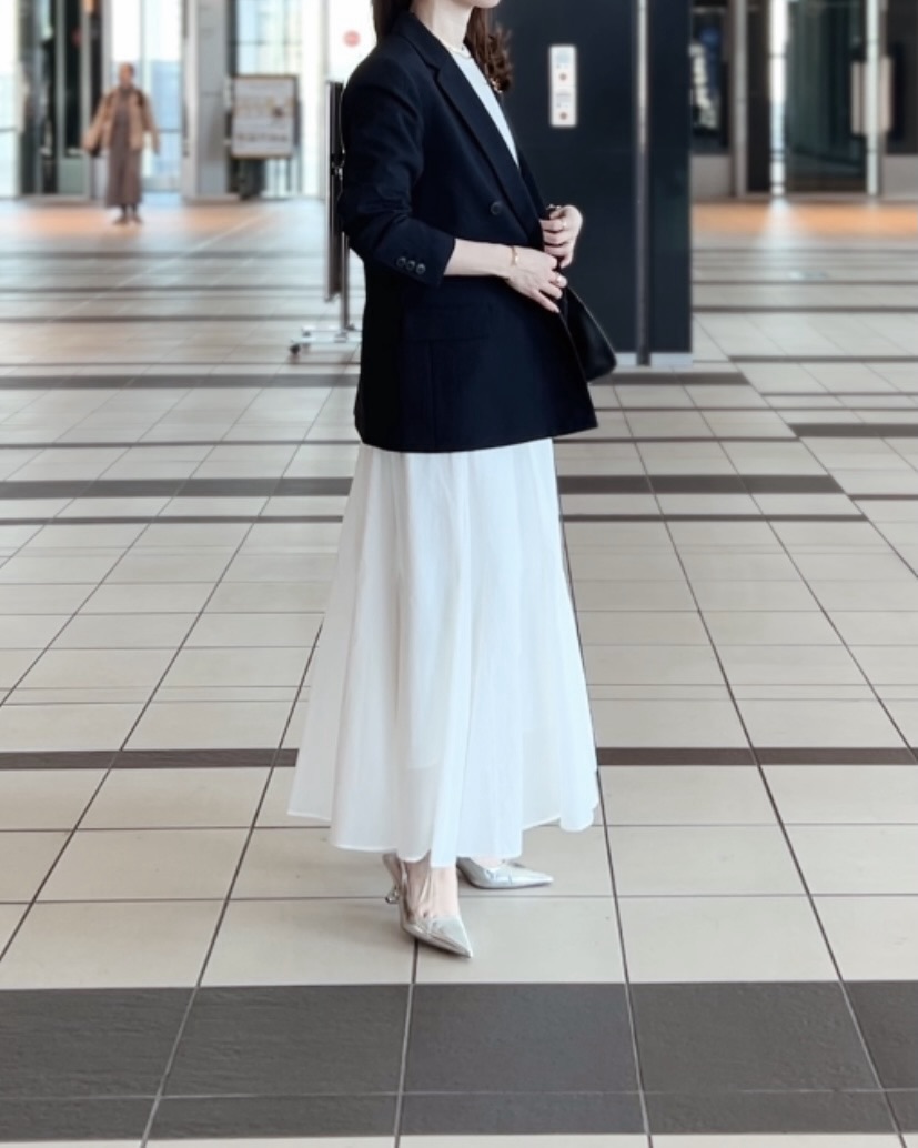 スカートスタイルが多い人におすすめしたいのが「ダブルジャケット/ストライプ」(5,990円 4/6現在)。ドレープ感のある生地で、堅苦しくならなくて優秀。