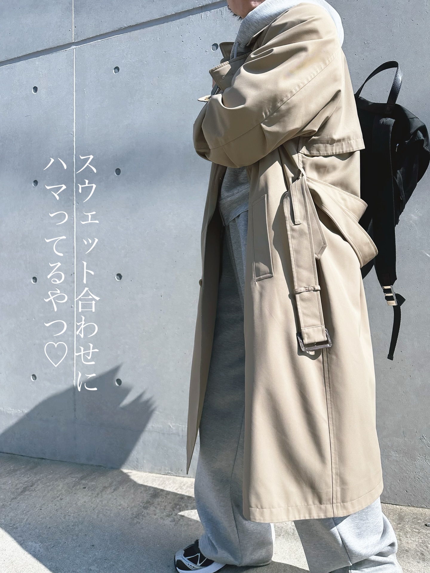 スウェットと合わせるきれいめカジュアルが気分。オーバーサイズなのでバサッと羽織ることができ、アンバランスになりません。