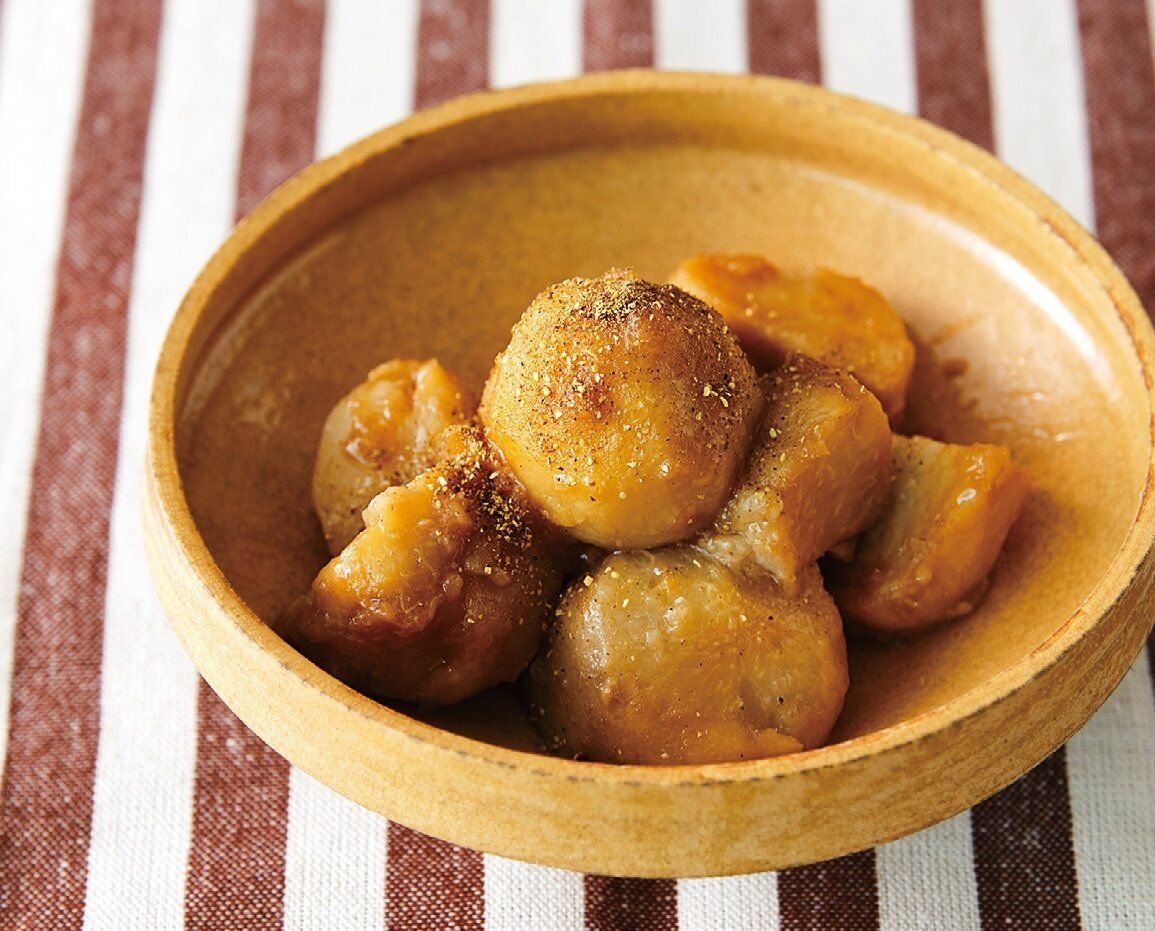 里いもは洗って1個ずつラップで包み、電子レンジで5分、竹串がスーッと通るようになるまで加熱し、粗熱が取れたら皮をむき、2~3等分に切る。フライパンに里いも、[A]を入れて中火にかけ、汁けがなくなるまでころがしながら煮る。器に盛り、粉山椒をふる。