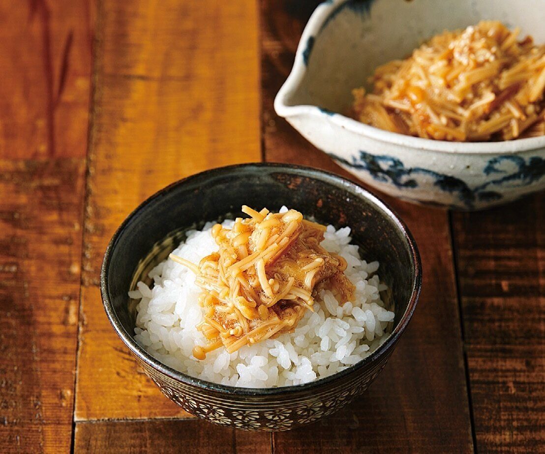鍋にえのきだけ、[A]を入れ、弱めの中火にかける。菜箸で混ぜながらひと煮立ちさせ、ふたをして7~8分、汁けがなくなるまで煮つめる。塩少々で味をととのえ、ごまをふる。