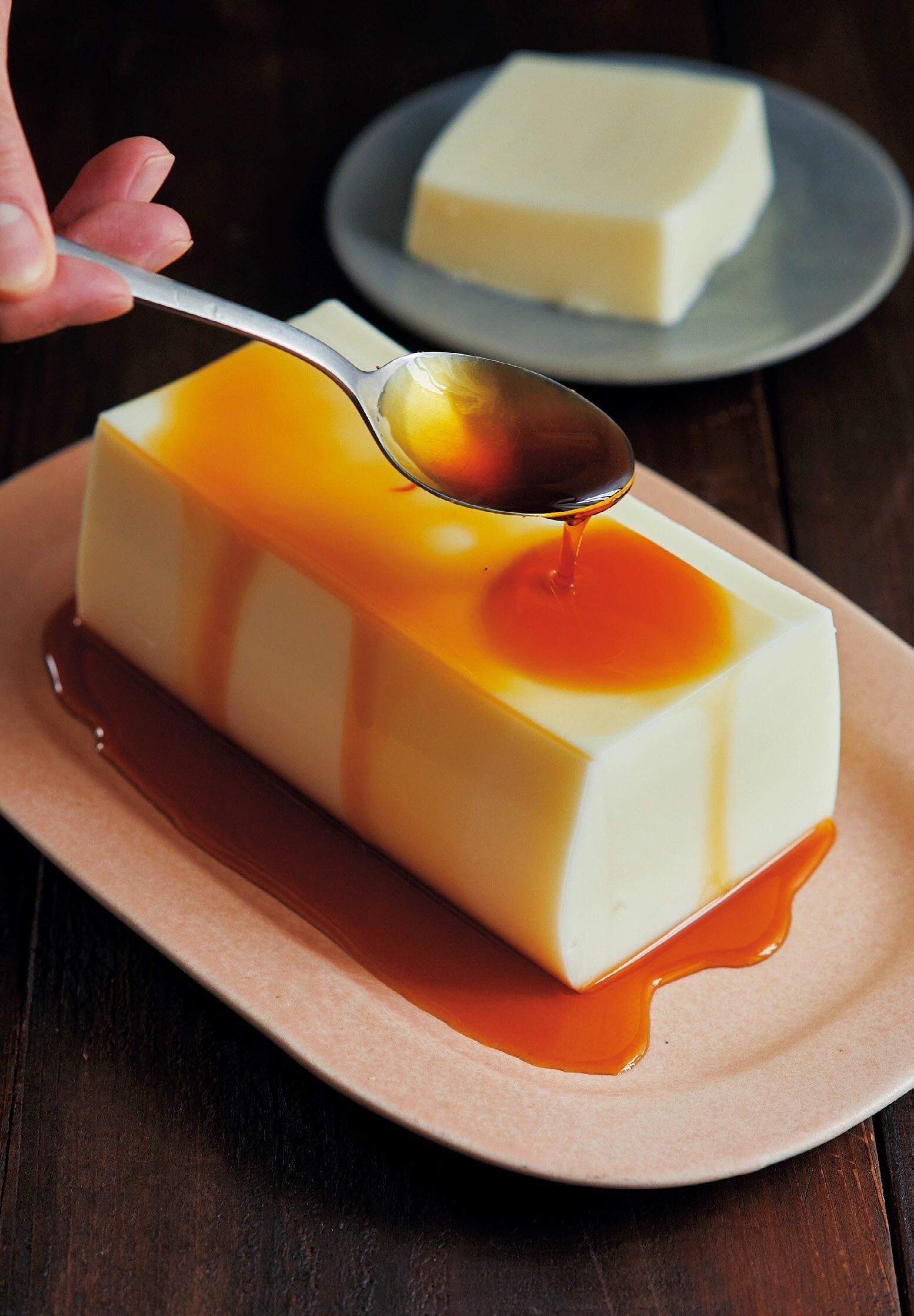 (3)(1)の牛乳パックを切り開いてプリンを取り出し、器に盛って(2)をかける。