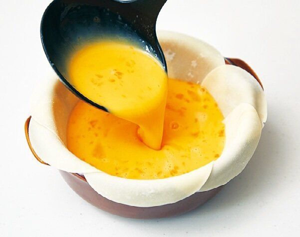 (2)耐熱皿に餃子の皮を敷き詰め、(1)を注ぎ、ラップは掛けずに電子レンジで4分チン。