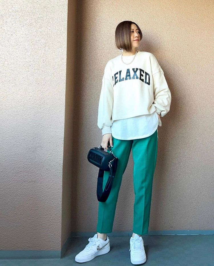 グリーンを合わせることで、普段着に見えがちなスウェットもおしゃれなお出かけファッションの仲間入りできちゃいます。