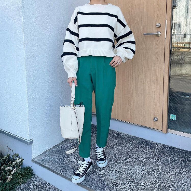 1枚は持っているという人も多い「ボーダー柄」もグリーンの「ストレッチテーパードパンツ」を合わせることで今年の顔のファッションに大変身。