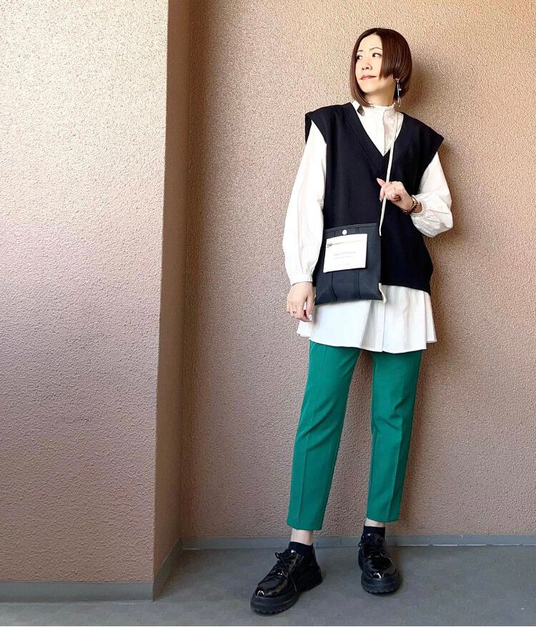 白のブラウス+黒のベストとレイヤードスタイルの王道の組み合わせにグリーンを合わせることで抜け感をプラスできちゃいます。