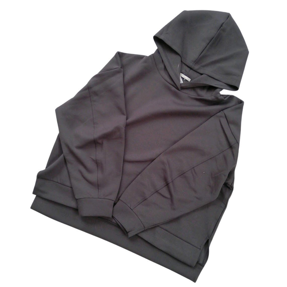 もちっとした触り心地のダブルフェイス素材。つるんと光沢があるので、綿のパーカーに比べるときれいめな印象。大人世代におすすめしたいパーカーです。
