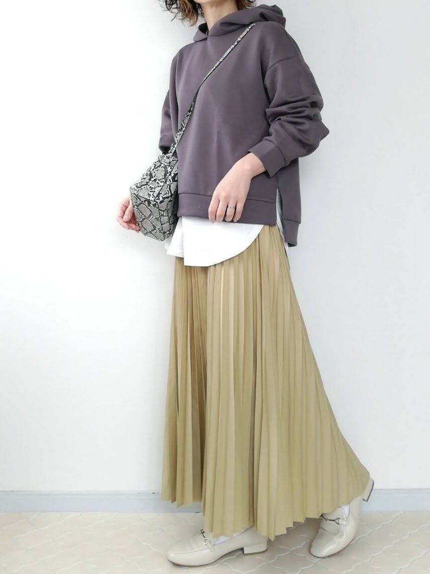 細かいプリーツを選ぶことで、ドレッシーな雰囲気が加わり女らしさがアップ。グレー・ベージュ・モノトーンと定番カラーでまとめることで、品のいいカジュアルコーデが完成しますよ。