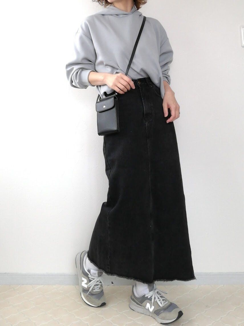 パーカー×タイトスカートのシンプルカジュアルコーデ。