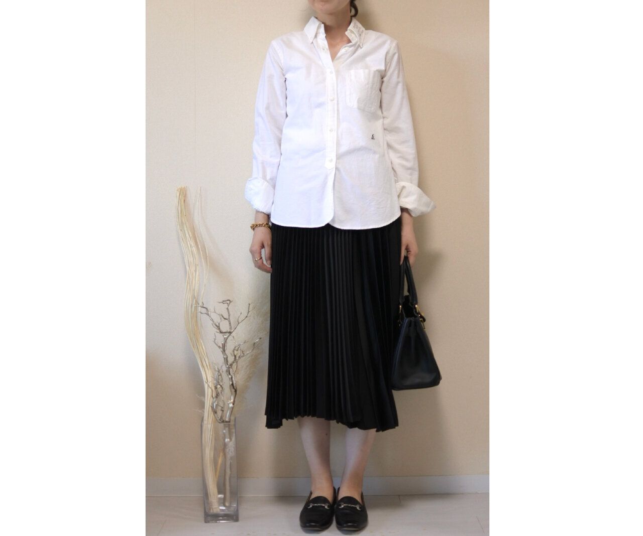 かっちりしたシャツに膝丈スカートにローファー。