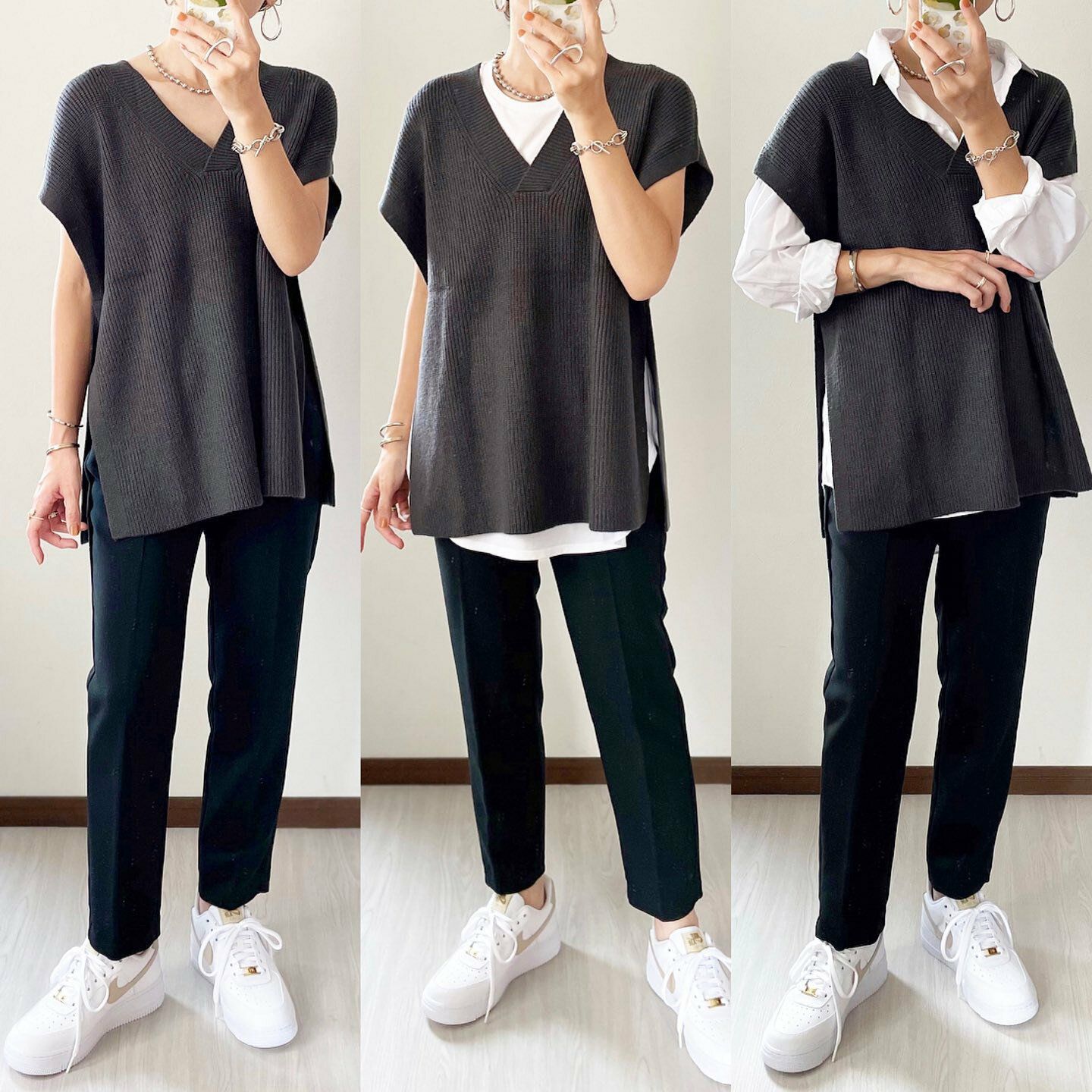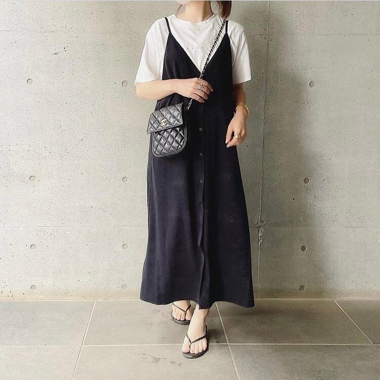カットソーや薄手のニット、透け感あるトップスなど様々なアイテムをレイヤードするのにぴったり。フロントボタンがついているので、着映え感もバッチリ。すっきりとしたシルエットで大人っぽく着こなせます。