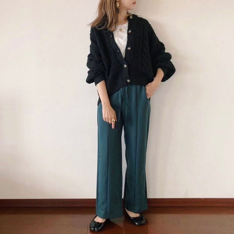 着るだけでこなれて見えるコクーンシルエットで、ワイドボトムと好相性。気になるフレアボトムも、こんなコンパクトなカーディガンがあるときれいに着こなせるはずですよ!