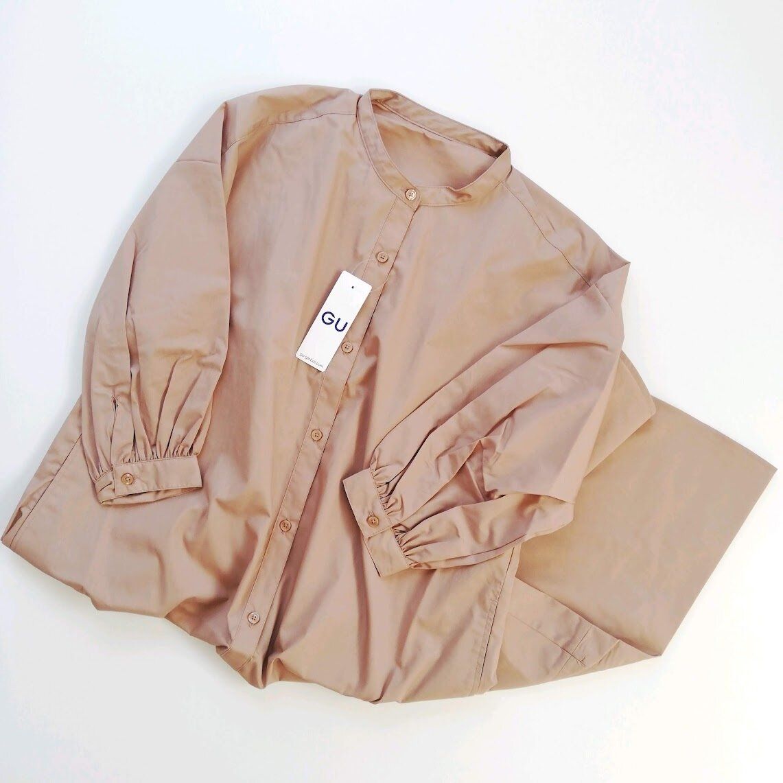 GUの「バンドカラーシャツワンピース(7分袖)」は、価格2,990円(2021/8/19時点)。ポリエステル65%・綿35%のライトな生地。つるっとしたなめらかな触りごこちです。