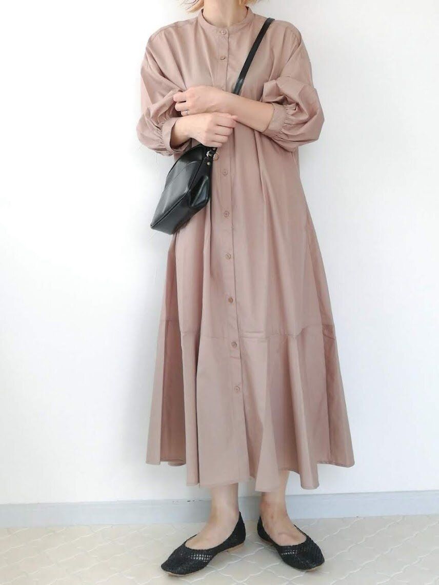 いまの気分なバンドカラーと、フレアに広がる裾の切り替えがトレンドライクなデザイン。1枚でワンピースとして、前をあけて羽織りとして活躍してくれる着回し力も人気の理由です。