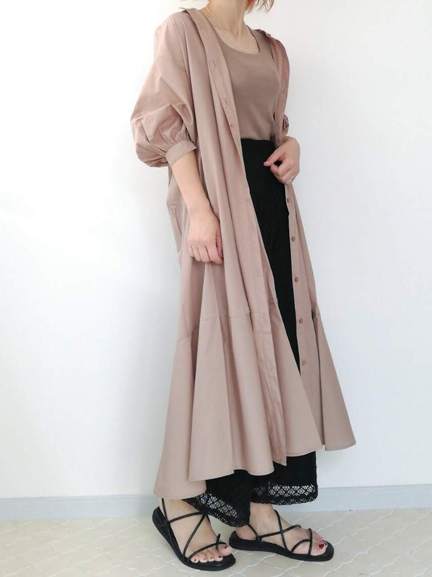 羽織りコーデ1:ベージュ×ブラックでスタイリッシュに