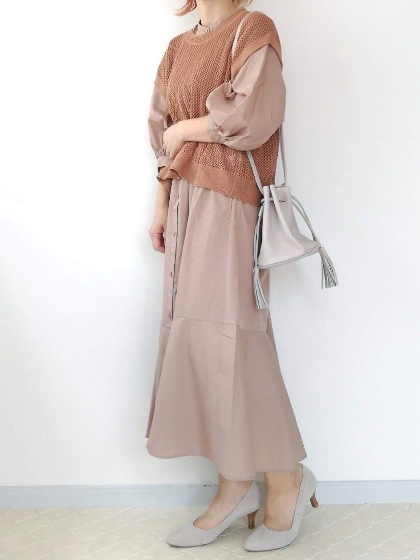 ワンピース×ワンピースのロング丈レイヤードで、今っぽさのある着こなしが叶います。かごバッグやメッシュサンダルでブラウンを効かせて。