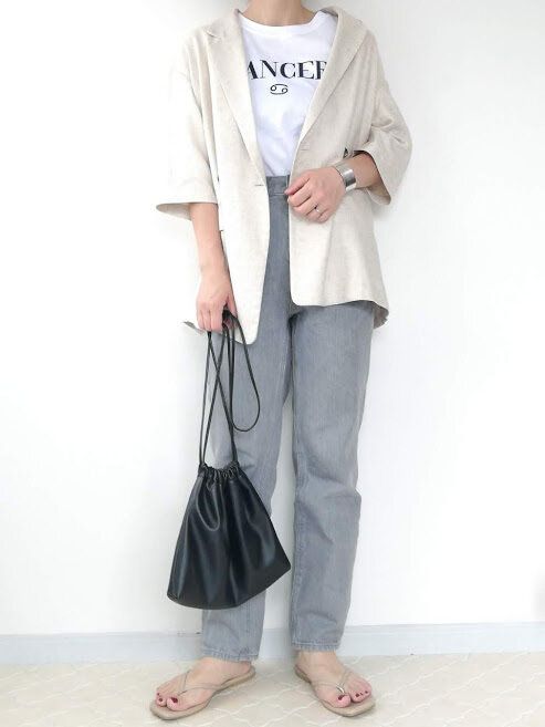 ロゴT×デニムのカジュアルコーデに羽織って。いつものコーデに羽織るだけで、トレンド感がプラスできます。