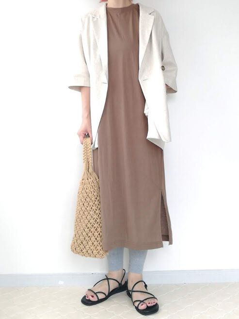 ワンピースだけでなく、タンクトップやキャミソールの羽織りとしてもおすすめです。アースカラーでまとめて、リラックス感ある夏コーデに。