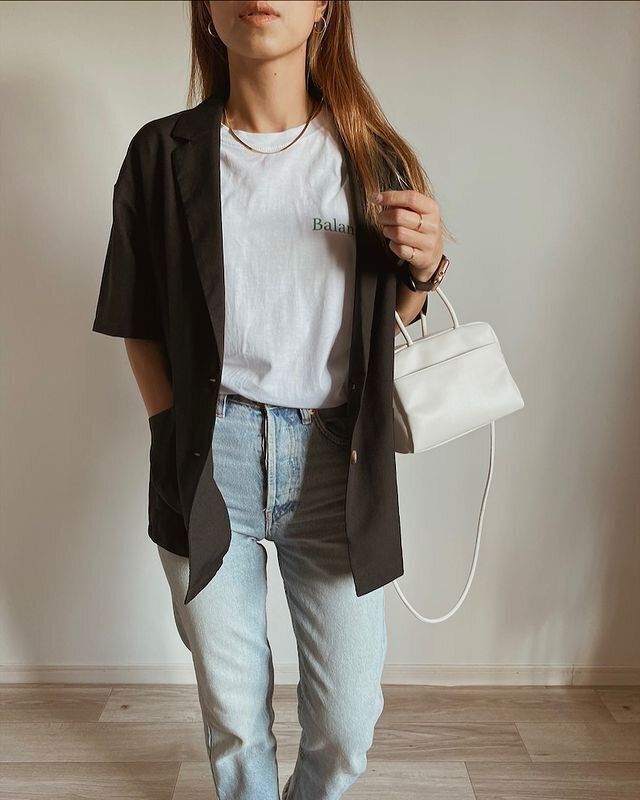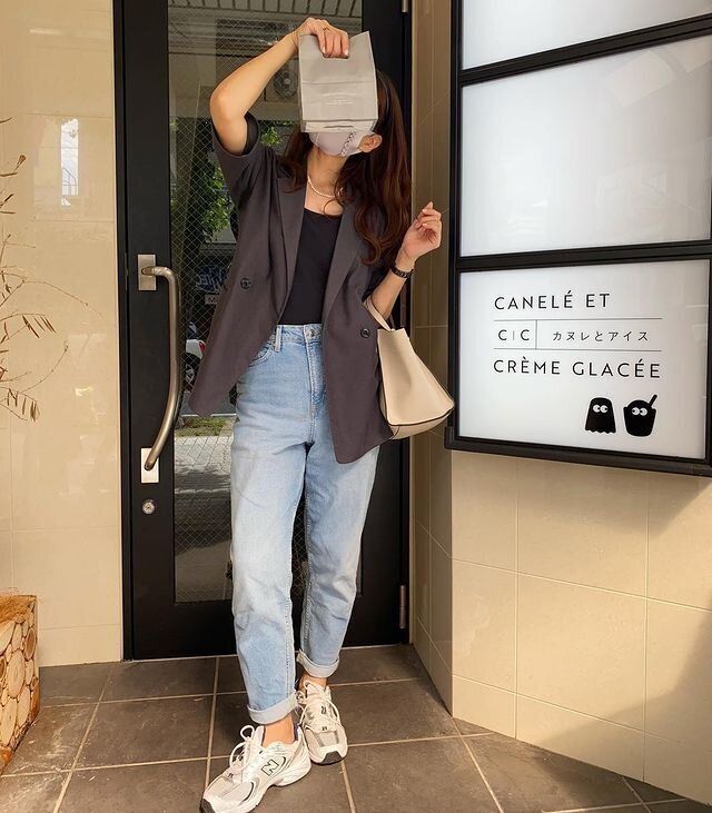 カジュアル度強めのライトブルーデニムを、半袖ジャケットのきちんと感で大人っぽく。ネックレスやきれいめバッグで、きれいめなスタイリングに。足元はボリュームスニーカーで外すとこなれた印象になって◎。