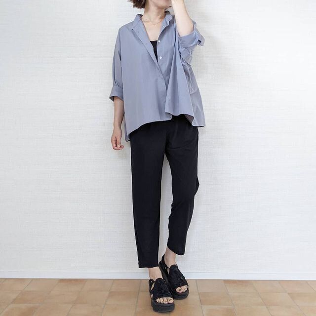 同じくユニクロのクレープジャージーテーパードパンツに合わせた、シンプルきれいめなカジュアルコーデ。