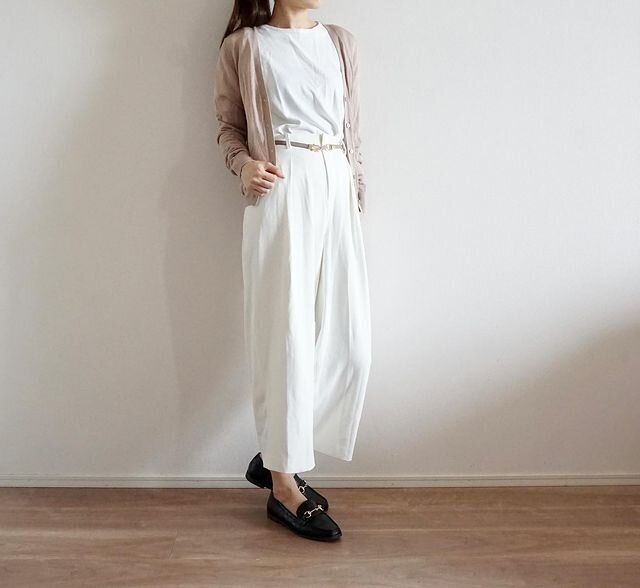 タック入りのワイドパンツ×ローファーでトラッドなスタイリングに。