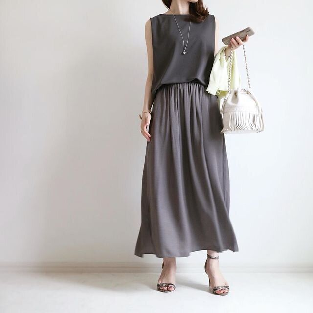 ボートネックが女らしいノースリーブTシャツ。同じくユニクロのシャイニーギャザーロングスカートと合わせて、セットアップのようなスタイリングが素敵です!