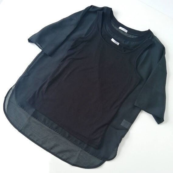 ほどよい透け感のシアートップスと、同色タンクトップのセット。シアー素材のトップスは、ゆったりとしたオーバーサイズで体型カバーも期待できます。
