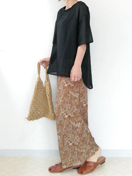 ペイズリー柄のプリーツパンツでリラックス感あるスタイリングに。柄ボトムスを邪魔しない無地トップスのおかげで、派手に見えない着こなしが叶います。