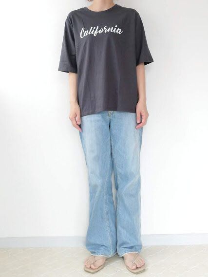 安っぽく見えないシックなダークグレー。上品な書体と控えめなサイズ感ののロゴのおかげで、子どもっぽく見えず大人女子にぴったりなんです。肩が落ちるオーバーサイズ感も今っぽく見えるポイント。