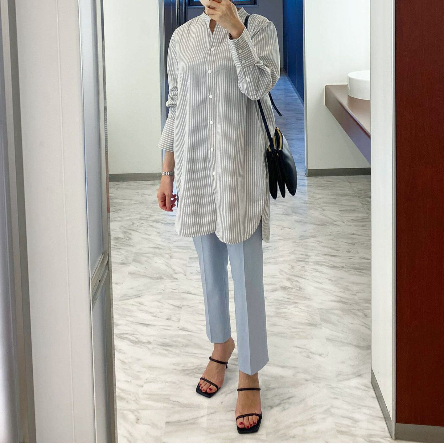 オフィスコーデにも通用するきれいめファッションが得意なプチプラブランド、ur’s(ユアーズ)では、着丈の長い「コットンチュニックブラウス」、4,389円をチェック。ベーシックな形とサイズ感で着回しが効きます。シンプルなスラックスに合わせれば、きちんとシーンにもマッチ!