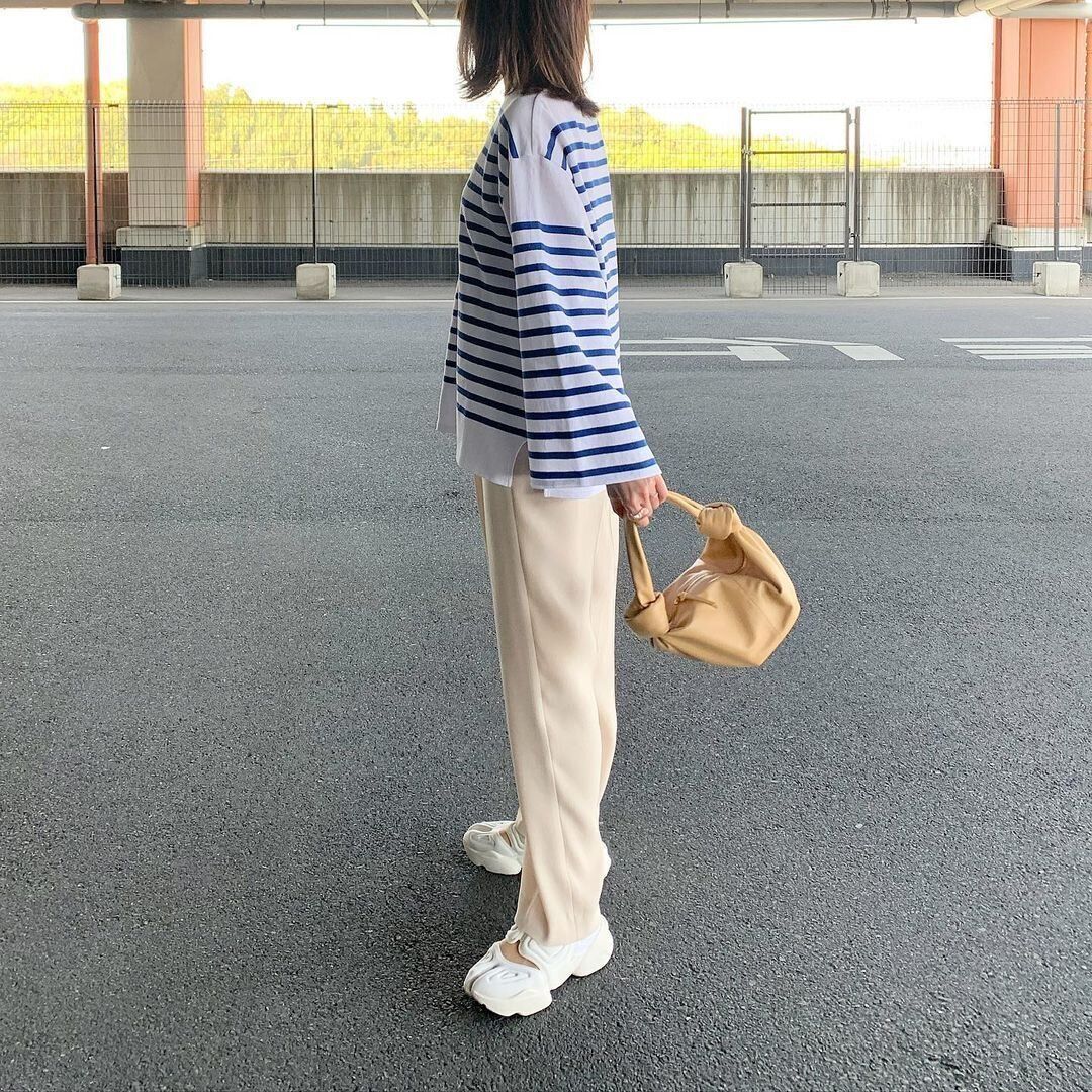 ボーダーを着ると、どこか野暮ったく見えてしまうなら、ネックラインが無地になった「パネルボーダー」を選んでみましょう。首まわりがスッキリするのでコーディネート全体も奥行きが出せます。今年はゆったりとしたサイズ感を選ぶのがコツ!