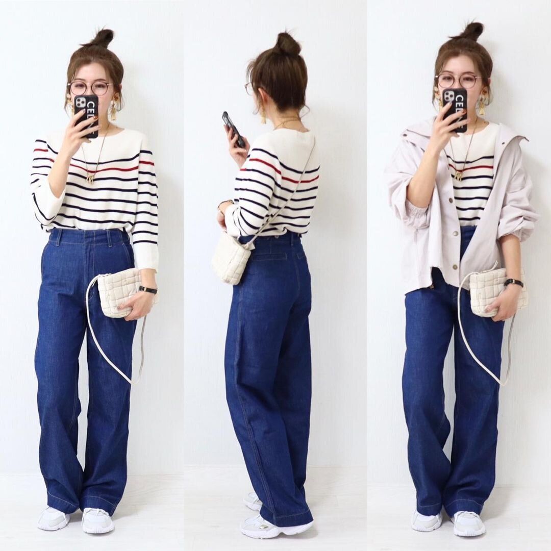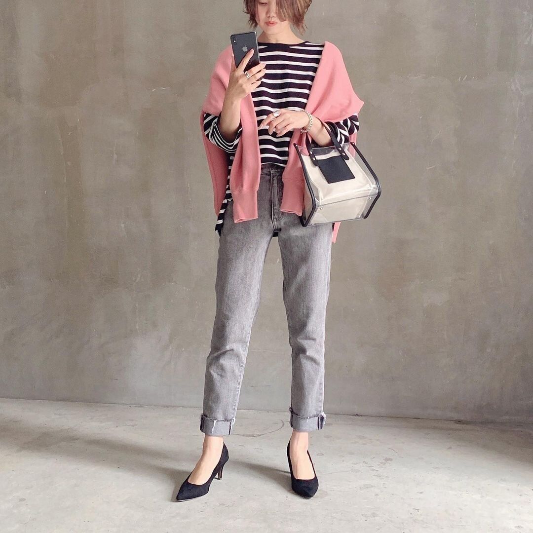 ベーシックカラーのボーダーアイテムを使っているなら、春色カラーのトップスを肩かけしてみるのもいいでしょう。シルエットに立体感が出せるので、「ボーダーを着ると間延びする」という問題も解決!さらに春色カラーならシーズンムードも加わり◎。