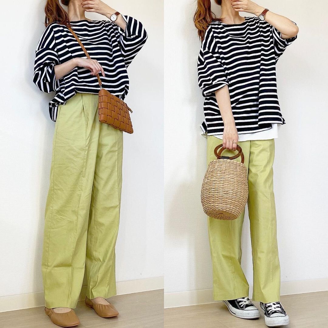 「メリハリ感を出したい」なら、レイヤードして着こなしに奥行きを加える方法も。ゆとりのあるボーダーカットソーならインナーのレイヤードもラクに行えます。カラーボトムに合わせたフレッシュな着こなしも好感を呼びますね。