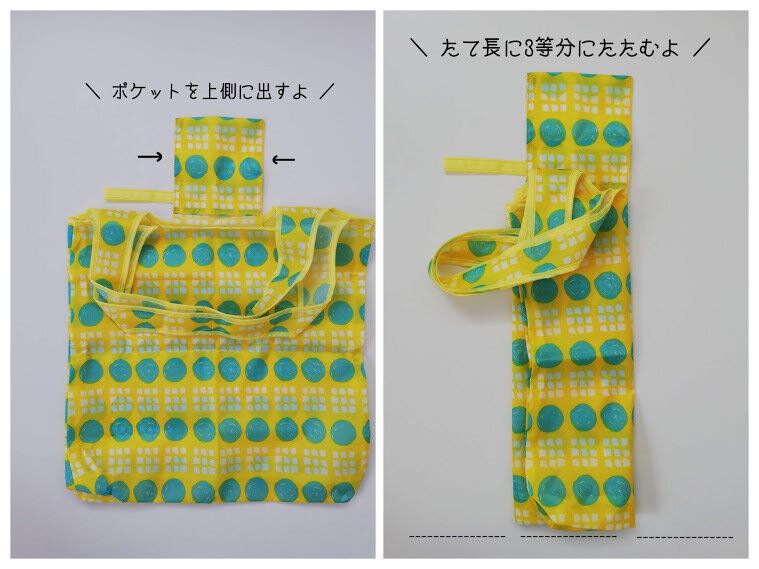 上記の画像の手順で畳むと、きっちりときれいに畳めますよ。畳み終わったときについている「取っ手」の部分を、カラビナでふだん使いのバッグにつけておくのがイチオシの持ち運び方です!