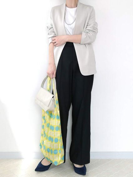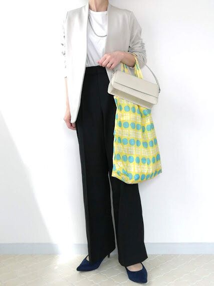 アラフォーはスモーキーな色合いがときとして「地味見え」することもあるので、きれい色のエコバッグをアクセントとしてプラス。