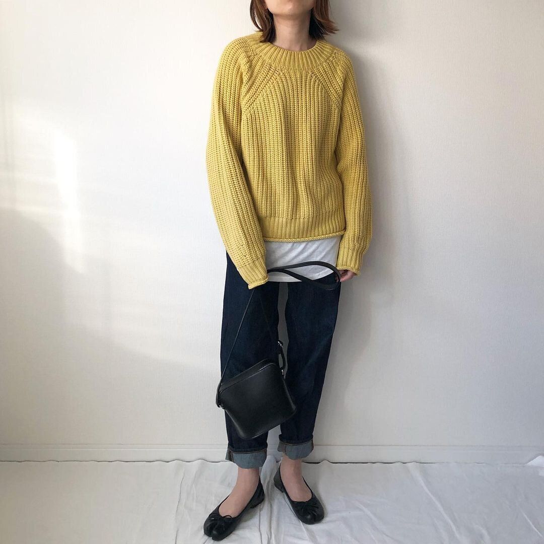 ザックリとした編み目で春本番も着やすい「ローゲージハイネックセーター」(1,490円)は春色を選ぶのが正解!ラグランスリーブを採用し、肩を華奢に見せてくれます。より今年らしさを追求したい人は、カットソーやシャツとのレイヤードもおすすめです。デニムに合わせるだけで今っぽいスタイリングへと導いてくれて◎。