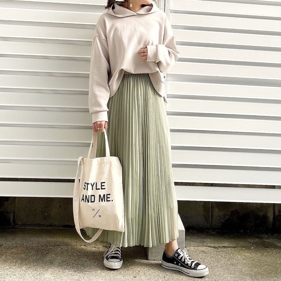上品見えするプリーツスカートはツヤ感で更新